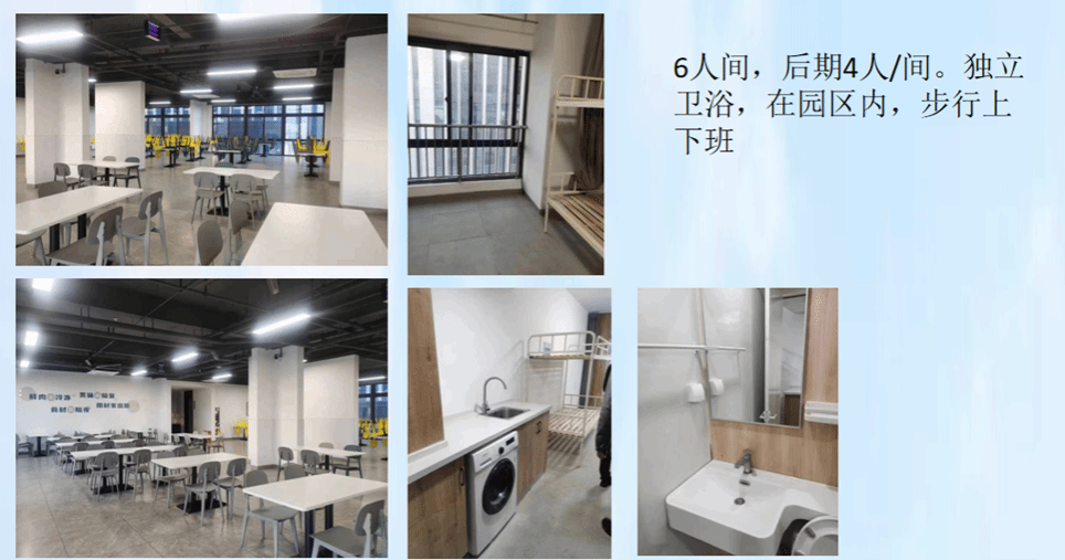 食宿:6人/间(后期4人/间),有空调热水,水电平摊;住宿步行3分钟可到生产区域。
