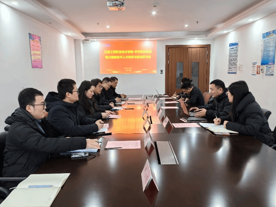 中天科技新能源产业集团党委副书记兼人力资源总经理钱蒋锋、总工程师谭清武、中天电源技术有限公司总经理董航飞、中天科技集团人力资源部招聘经理蔡彩虹、中天科技新能源产业集团人事经理王媛媛接待了学校一行。钱蒋锋对郭江峰一行表示欢迎,感谢学校长期输送优质人才,并介绍了企业发展及人才需求情况。他表示,中天科技作为“三新两高”市域产教联合体牵头企业,愿与学校进一步细化人才培养方案、优化课程体系,选派骨干技术人员与学校“互兼互聘”、开放核心生产车间和实训资源,助力师生在真实生产场景中锤炼实践技能、提升职业素养,深化校企协同育人成效。座谈交流中,双方围绕深化校企合作内涵、企业最新技术与人才需求、岗位供给保障及电力储能应用技术专业人才培养路径等核心议题,展开了全面深入的探讨,达成多项共识。