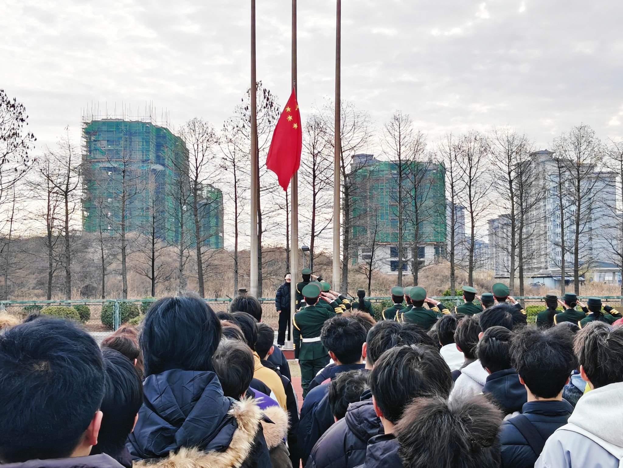 晨光熹微,仪式正式开始。国旗护卫队队员精神抖擞、步履铿锵,护送五星红旗走向升旗台。伴随着雄壮激昂的《义勇军进行曲》,鲜艳的五星红旗冉冉升起、迎风飘扬。全体师生肃立注目,高唱国歌,现场庄重肃穆,洋溢着浓厚的爱国热情。