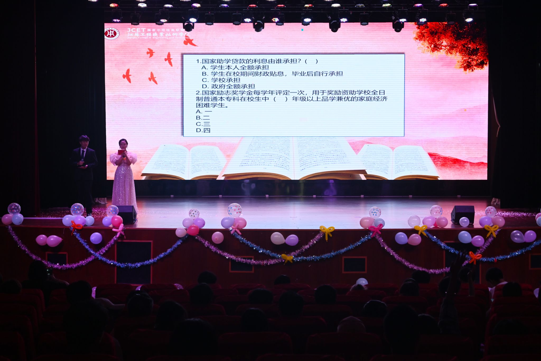 本次活动共有10位选手进入决赛,他们通过PPT展示和现场演讲的形式,结合自身成长和学习经历,深情讲述资助政策对于自己求学道路的帮助及改变,分享学习生活中的苦与乐,表达了对国家资助政策的感恩。中场歌曲《安静》《没那么简单》以悠扬的旋律彰显青春力量;“资助政策知识”问答环节,通过抢答的形式,围绕国家助学贷款、助学金申请等政策内容展开互动,在热烈的竞赛氛围中深化了政策宣传效果。