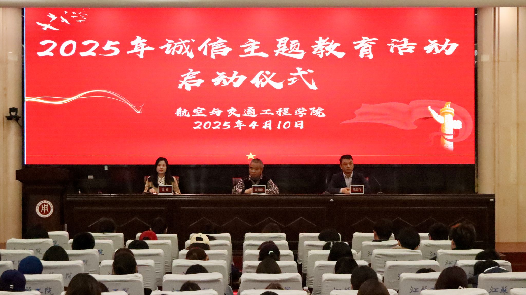 为深入贯彻落实立德树人根本任务,强化学生诚信意识,4月10日,航空与交通工程学院在海门校区200人报告厅举行2025年诚信主题教育活动启动仪式,海门校区管理办公室副主任梁海峰、航空与交通工程学院党总支副书记陈益飞、23、24级班主任、学生代表参加了启动仪式,会议由温蝶主持。