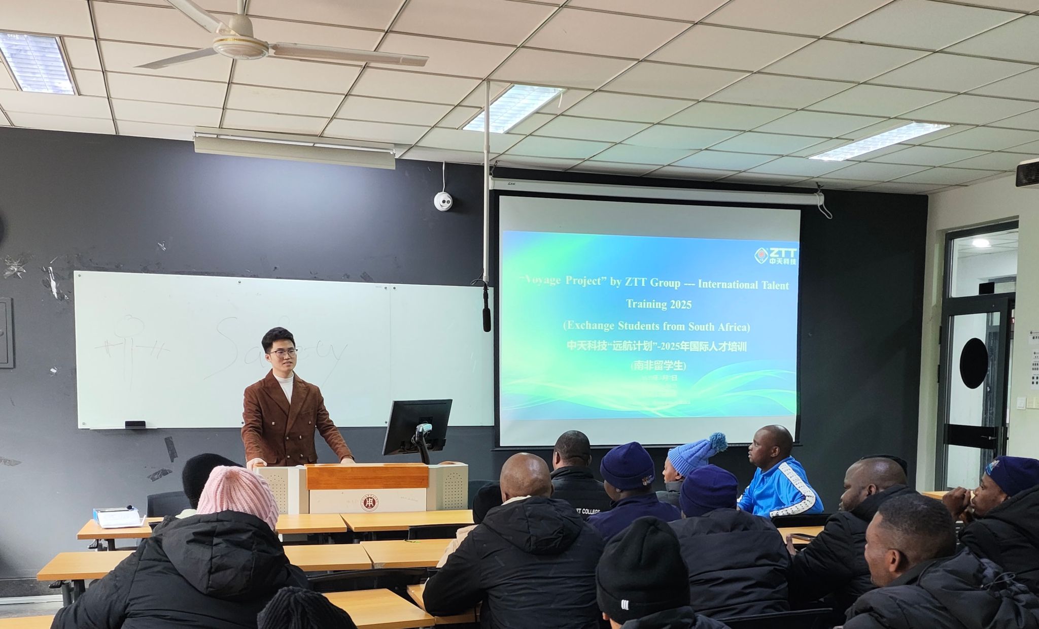 3月7日,航空与交通工程学院与中天科技集团联合举办南非留学生顶岗实习项目正式启动。中天科技集团人力资源部经理蔡彩虹、新能源国际事业部安东明一行来校,为我校20名南非留学生开展顶岗实习安全培训。培训会议由航空与交通工程学院挂职副院长梁博主持。