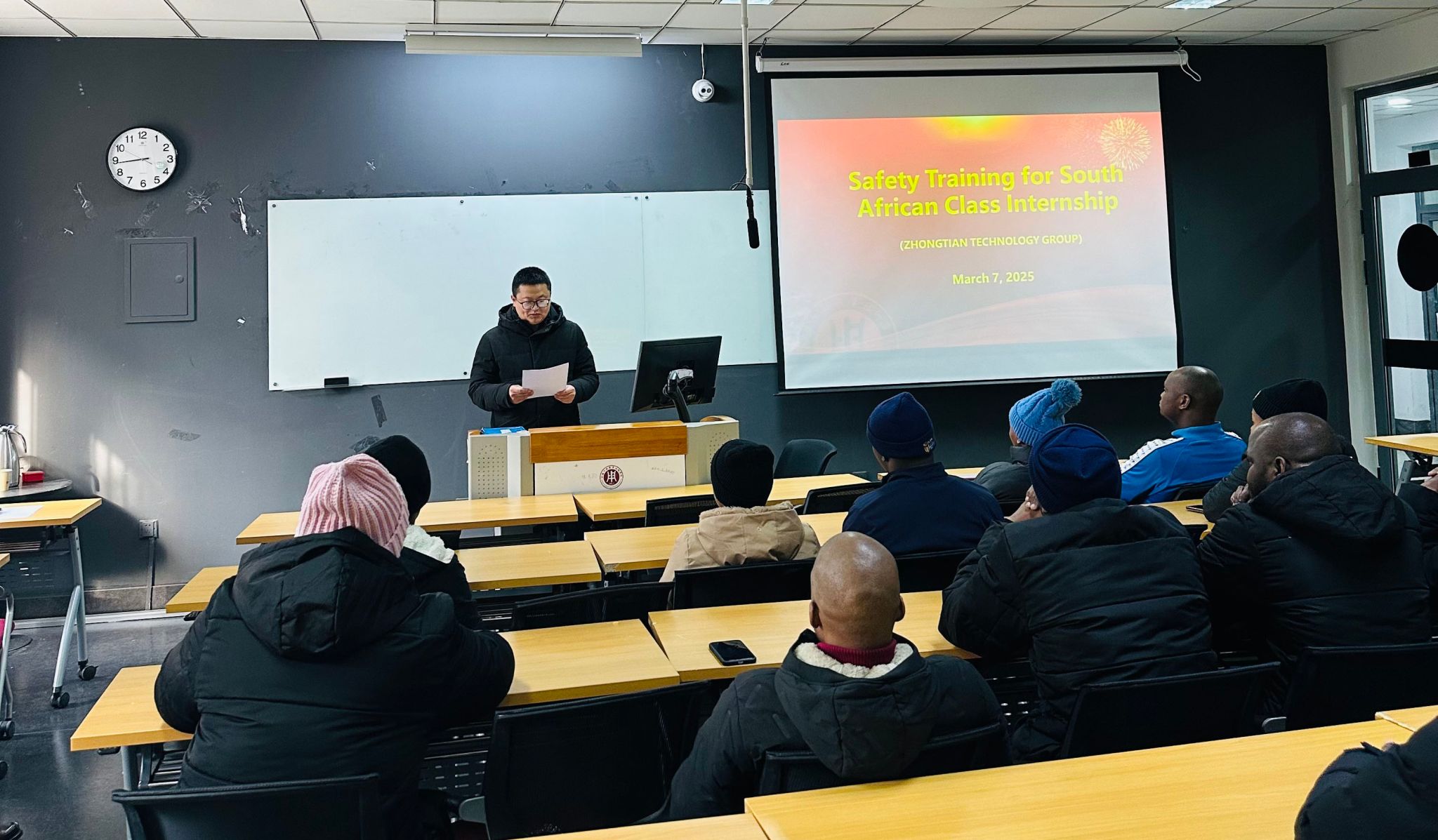 培训会上,蔡彩虹与安东明从企业文化、实习注意事项、培训方案三方面展开讲解,重点强调了安全生产规范与跨文化适应要求,表示中天科技集团将“安全第一”理念贯穿实习全程,通过标准化操作培训、定期座谈会及生活保障措施,为留学生提供安全、高效的学习环境。南非留学生代表表示,这次实习是理论与实践相结合的重要机会,他们将以严谨的态度学习技术,尊重中国文化,为中非友谊添砖加瓦。梁博强调,顶岗实习是职业发展的关键一步,希望同学们珍惜机会,将所学转化为未来职业发展的核心竞争力。