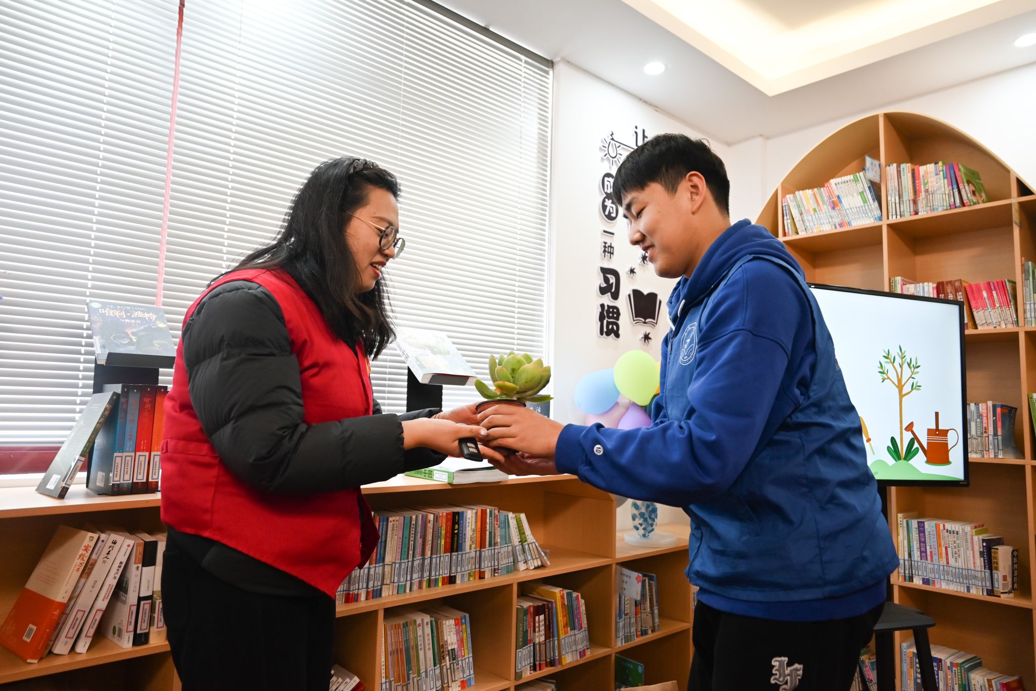 在海韵书舍,志愿者们组织开展“以书换绿”公益行动,鼓励村民和学生捐赠闲置书籍,每捐一本书,可兑换一盆多肉植物。所募书籍将统一捐赠至港新村农家书屋,为乡村孩子带去更多阅读资源,促进乡村文化建设。