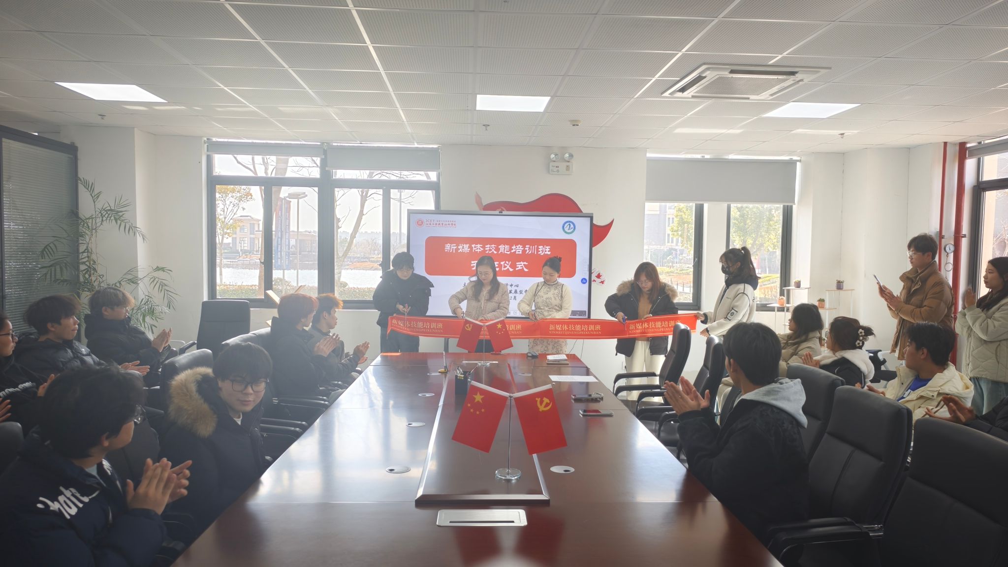 开班仪式上,詹蕾围绕就业发展和个人成长等方面,强调掌握新媒体技能有助于提升职业技能和未来就业竞争力,丰富在校期间的学习体验,对大学生未来成长具有重要意义。项目负责人方璐对项目安排和内容进行了详细介绍。本次培训班课程安排包含写作技巧、摄影摄像、PS基本操作、微信推送排版和实操演练、电子邀请函制作等内容。活动最后,与会师生进行了剪彩合影。
