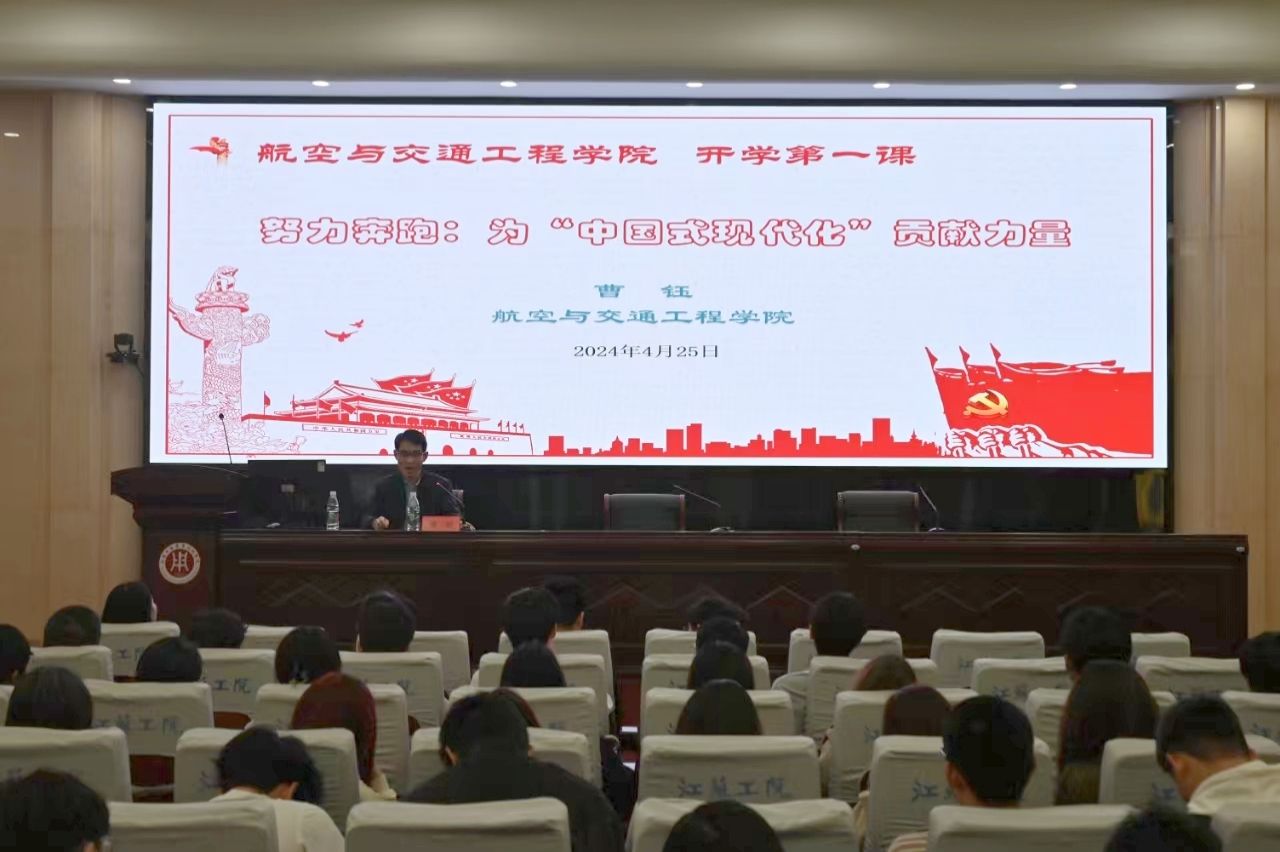 4月25日下午,航空与交通工程学院党总支书记以“努力奔跑:为‘中国式现代化’贡献力量”为题,为青年学子讲授开学第一课。,学院学生代表、全体辅导员和班主任参加学习。
