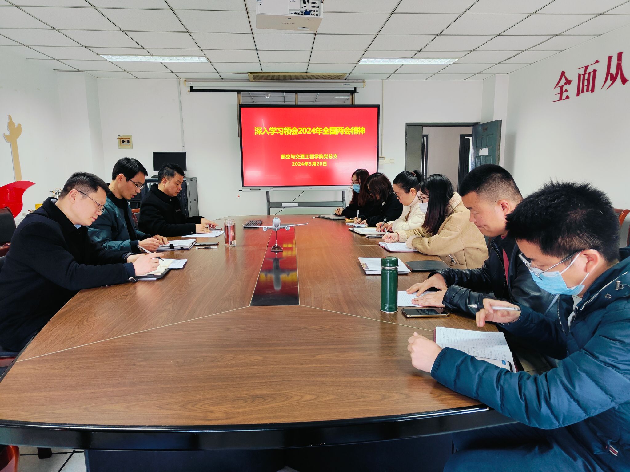 为深刻领会全国两会精神的重大意义和丰富内涵,3月20日,航空与交通工程学院理论学习中心组在强毅楼1104会议室召开专题学习会,传达学习2024年全国两会精神。学院党总支书记曹钰主持会议,学院理论学习中心组全体成员、支部书记和支部委员参加学习。